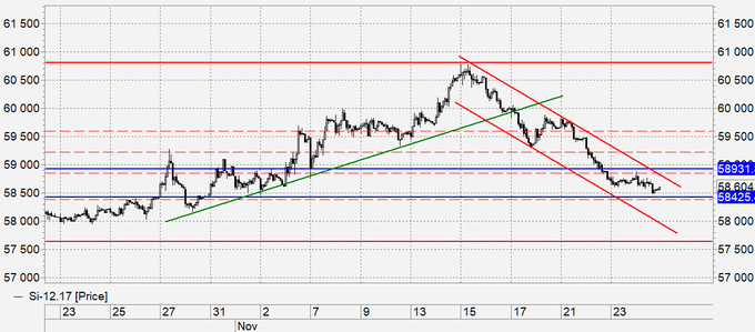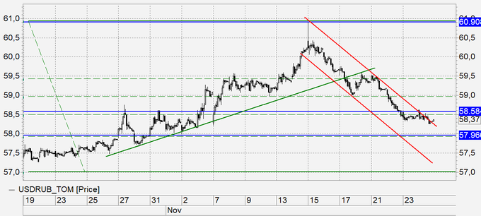 Рубль: если рынок вырастет выше 58.60, то мы быстро окажемся на 59.20, дальнейшее неизвестно. Очень бы хотелось для хорошей покупки увидеть касание 58.00. Если нефть продолжит рост, то именно это и произойдет.