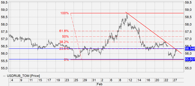Рубль: нефть упала на 1 доллар, рубль поспешил ослабнуть следом за ней. На USDRUB_TOM мы не пробили важную поддержку на 55.50 и у доллара пока остаются шансы на рост. На более глобальной картинке появилась угроза формирования двойного дна. Эту идею можно отрабатывать после того как рынок вырастет выше 56.50.
