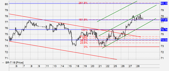 Покупка: нет. Кто в позиции, перенесите стоп на 76.95. Цель: 80.00 (84.00).