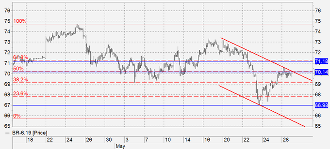 Нефть: рынок приостановил активные действия до появления информации по добыче в США. Сегодня ждем API, завтра EIA, смещение выхода данных произошло из-за праздников. Продолжаем отмечать, что уровни удобны для продаж. Только рост выше 72.50 разломает медвежью мозаику, которую продавцы так старательно собирают с начала мая.