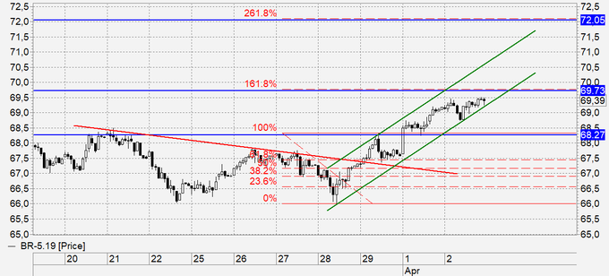 Продажа: при касании 69.74. Стоп: 69.86. Цель: 68.41.