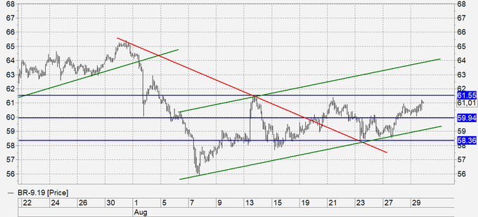 Нефть: уже можно сказать, что лето заканчивается для нефти на мажорной ноте. И выглядит все не так и плохо, как казалось всего месяц назад. Не исключено, что 65.00 нас будет ждать еще одна атака медведей. А именно там мы окажемся, когда сможем взять 61.50. Если же этого не произойдет в рамках текущего движения, то покупателей охватит настолько сильное расстройство, что мы очень быстро полетим к 50.00. Много будет зависеть в ближайшее время от решений ФРС и ЕЦБ, если от мягкой кредитной политики откажутся (особенно это касается США), то цены на нефть продолжат оставаться под давлением.