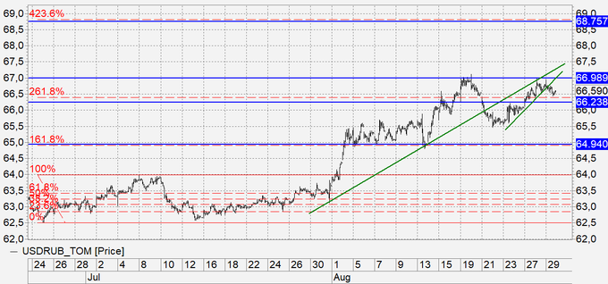 Рубль: пытаемся пытаться остаться под 67.00. Выбрать более верное место для борьбы было бы трудно. Напомним, что рост выше 67.00 приведет к пробою долгосрочной линии сопротивления. Сегодня будет небольшая драка за то, как закроется месячная свеча. Быки могут предъявить претензии именно к уровню 67.00, если их не будет, рубль может ждать относительно спокойная осень. В политике нас потихоньку начинают все любить, точнее, терпеть и разговаривать, что добавляет оптимизма при любом развитии событий на рынках.