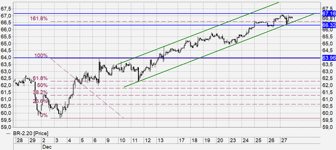 Нефть: утро понедельника начинается в Азии с падения котировок. Коррекция напрашивалась. В случае хода ниже 66.30 мы пробьем поддержку и можем рассчитывать на падение, чей размер будет равен ширине канала 1.80 доллара. Таким образом первоначальная цель для коррекции находится у нас на 64.50. В случае движения ниже 64.00 импульс вверх будет нивелирован и на рынок вернутся продавцы.