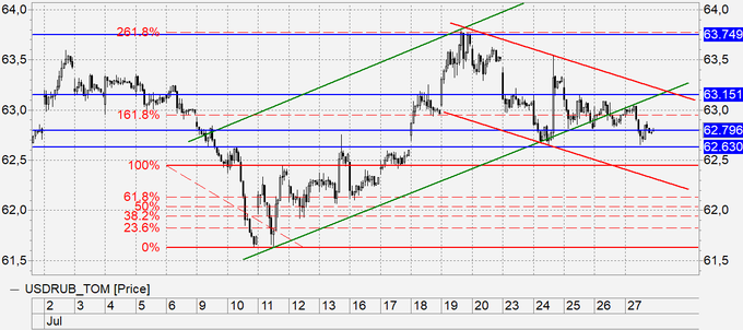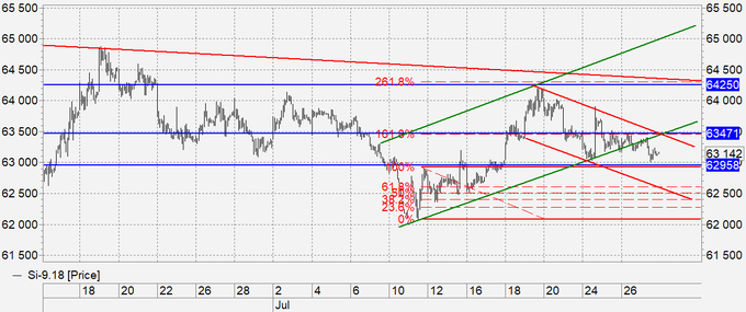 Рубль: технически все готово к ходу на 69.00. Картинка сломается только если мы упадем ниже 62.50. Тогда откроется вариант хода на 60.00. Ниже этого уровня рынок не виден. В текущей ситуации посматриваем на нефть и в случае падения последней покупаем на часовках. В случае пробоя вверх уровня 64.00 ситуация станет однозначно бычьей по доллару. Более близким сопротивлением является уровень 63.15.