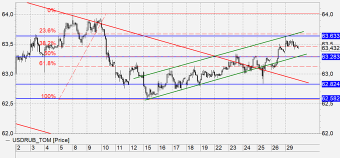 Рубль: а нефть не падает. Рубль пытаются вытолкнуть выше 63.50, но тут же находятся сомневающиеся в правильности таких действий. И мы в их числе. Предлагаем продолжать ставить на падение доллара. В случае прохода цен ниже 63.20 – продавать.