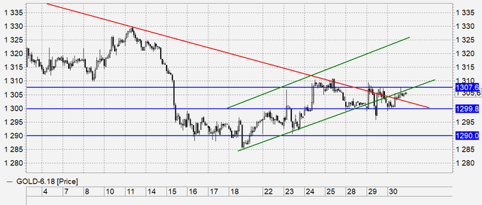 Золото: продолжаем рекомендовать находиться вне рынка пока мы не увидим или роста выше 1310, или падения ниже 1300. Ситуация продолжает оставаться неопределенной. Цены пять рабочих дней находятся в узком диапазоне. Никаких интересных возможностей по золоту сейчас нет.