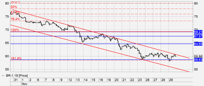Нефть: с трудом вчера быкам удалось удержать рынок от очередной фазы падения. Определенное внимание будет приковано к встрече в Аргентине глав 20-ти государств. Если будет высказана обеспокоенность продолжением роста мировой экономики это непременно ударит по ценам на нефть. Технически в случае роста выше 61.00 мы выйдем и падающего ценового канала и отправимся к 65.00, чем можно будет воспользоваться для продаж.