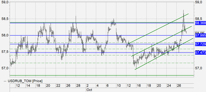 Рубль: рубль заканчивает неделю «шипом». Район 58.50 был взят на пару часов, потом, на фоне продолжения укрепления нефти, цены были отброшены к 58.00. Что бы это ни было, вряд ли оно сможет отправиться на 55.00 без роста нефти к 70.00.