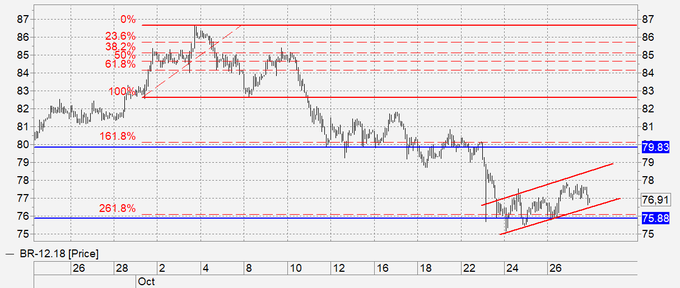 Нефть: пока рынок не оправдывает наши относительно оптимистичные ожидания. Возможный ранее ход к 80.00 теперь под вопросом, так как уже сегодня поздно вечером выйдут данные по запасам от API, а завтра вечером от EIA. И перспективы этих данных медвежьи. В рамках коррекции мы должны уходить на 70.00, и сегодня в случае падения ниже 76.00 данная мысль получит подтверждение. То, что мы нарисовали на рынке за последние три дня импульсом вверх никак назвать нельзя, а значит, возможно продолжение падения без захода на 80.00. Перейдем на декабрьский фьючерс Московской биржи.