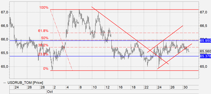 Рубль: вчера мы даже не обращали внимания на стоимость нефти. Сегодня, в случае падения Brent ниже 75.00, это вряд ли удастся. Пока мы стоим над 65.40 ситуация трактуется в пользу быков. Если же рубль окрепнет ниже данного уровня, то возможен ход на 64.00, но укрепление на фоне падающей нефти может вызвать фундаментальные вопросы. Не нужно забывать, что сейчас стоимость бочки 4900 рублей и с бюджетом все хорошо, он профицитен, а в случае хода на 60.00 долларов за баррель, и курсе рубля 60.00 рублей за доллар, бочка будет стоить 3600 рублей. При таких ценах бюджет наш утратит свой профицит, и начнутся крики, что же с нами будет дальше. То есть все примерно точно также как в Саудовской Аравии. День прошел, и хорошо.