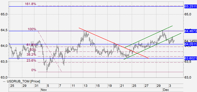 Рубль: рубль полностью копирует, с обратным знаком, последние движения нефти. Это объяснимо. Внутренних идей нет. Более того, последние данные по PMI за ноябрь в промышленности оказались самыми низкими за 10 лет. Надежда на восстановление, появившаяся в октябре, погасла. Пока у правительства достаточно денег рублю не будет грозить серьезная опасность. В случае пробоя вверх 64.50 рост продолжится. Держим лонги.