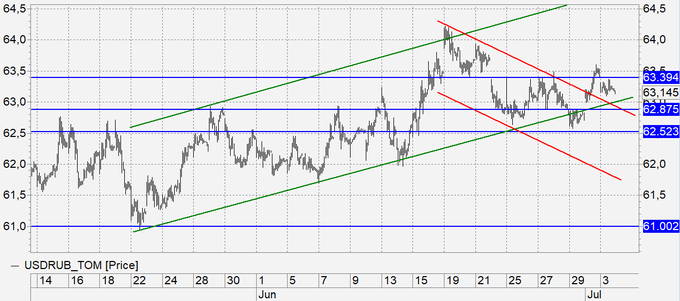 Рубль: если нефть продолжит дешеветь, то рублю не удержаться на текущих уровнях. Тем не менее, на текущий момент позиции рубля не так плохи. Откат от 63.50 способен перерасти в движение, которое отправит котировки ниже 62.90, а это, в свою очередь, создаст предпосылки для хода в район 61.00. Именно уровень 62.90 в данной ситуации является определяющим. Пока цены выше него смотрим по рублю вниз по доллару вверх, если цены уйдут ниже 62.90, то у рубля появятся шансы на укрепление.