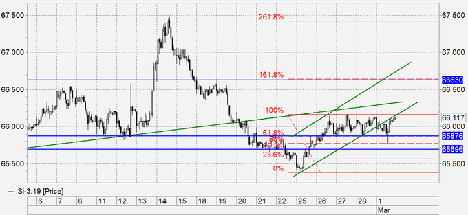 Продажа: при откате к 65.50 (66.00) Стоп: 66.60. Цель: 62.60 (55.00).