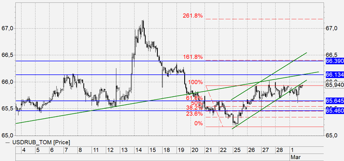 Рубль: так как от нефти сегодня ждем падения, то логично предположить, что отметка 66.00 по паре сегодня не устоит и мы пойдем выше. От района 65.50 доллар интенсивно покупают (см. длинные тени свечей), видимо где-то во сне видят отметку 70.00. Мы тоже видим такие сны, пока рынок выше 65.50, поэтому рекомендуем присоединиться к быкам по доллару.