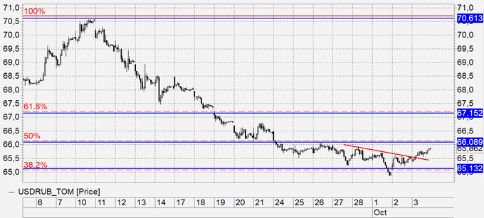Рубль: хочется думать, что наши вчерашние мантры о том, что надо и откатить вверх на 67.20 возымели действие. А почему нет? Все в наших руках. На «часовках» нарисовали перевернутую «голову- плечи», дисциплинированно протестировали «линию шеи» и пошли выше. Не смотря на рост стоимости нефти, которая начала вновь показывать цифры близкие к сюрреализму, рублю будет подсаживаться, так как рост цен на нефть в недалекой перспективе вызовет очень сильные проблемы в странах импортерах энергоресурсов. И сам спрос на нефть упадет.