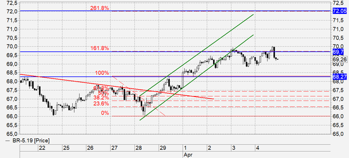 Продажа: при касании 69.68. Стоп: 69.86. Цель: 68.41.