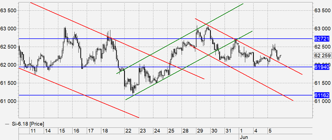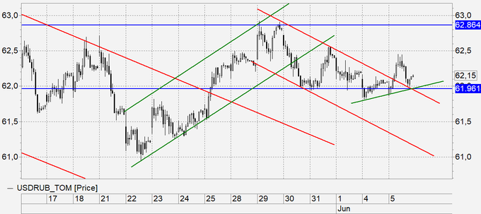 Рубль: вчера рубль вышел из падающего ценового канала и протестировал его с обратной стороны. Для быков по доллару лучше картинку и не нарисовать. Риск не велик, надо покупать и отыгрывать вероятность роста к 65.00. Мы не знаем, будет ли нефть расти сегодня, но можем предположить, что если не будет хода выше 66.50 (Brent), то рубль так и останется у отметки 62.00.