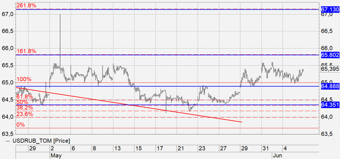Рубль: национальная валюта продолжает упираться. Пока Brent стоит у 60.00, а внешний политический фон остается нейтральным, есть шансы на то, что выше 65.80 мы не поднимемся. Но до данной отметки должны доходить. На рынке нет интересных идей. Не исключено, что мы просто будем стоять в диапазоне вплоть до 14 июня, когда ЦБ РФ объявит о своем решении по ставке.