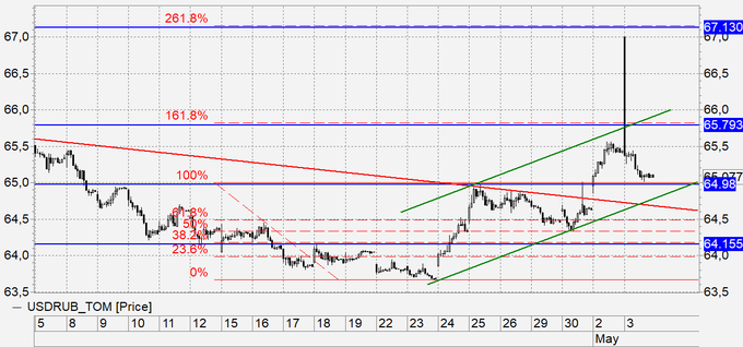 Рубль: инфляция в марте 5.3% (ВШЭ). Это не позволит Набиуллиной снизить ставку в ближайшее время, что должно в перспективе поддержать рубль. Тем не менее, мы продолжим сегодня находиться выше 65.00. Доллар должен получить положительный импульс в русле агрессивной политики Трампа.