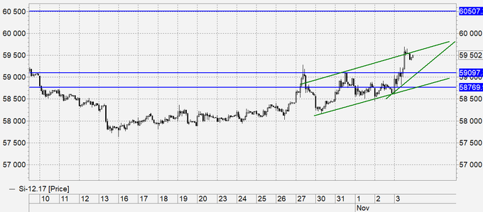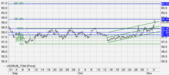 Наиболее вероятно: касание 59.35, откат к 58.50. Далее рост к 61.00.
