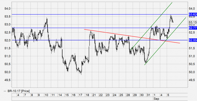 Покупка: кто закрыл цель на 53.40, от 52.00 – мои поздравления. Возможна осторожная покупка, с риском 0,2 – 0,3% от капитала от 52.80. Есть варианты, что рынок продолжит расти дальше в том числе на фоне урагана Ирма к 58.00.