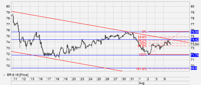 Нефть: вчерашний день оказался примечателен тем, что нефть так и не смогла забраться выше 74.50.  Данный факт может уже сегодня может привести к очередной фазе падения. Вчера США ввели первый пакет санкций против Ирана (пока не затрагивающий нефтяной сектор напрямую) и вместе с тем приглашают сесть за стол переговоров. Никто, кроме Израиля, в голос не поддержал подобные действия. Как видим, дверь оставлена для Ирана открытой. Но сядут ли персы за стол переговоров, или точнее, за стол ультиматумов, большой вопрос.