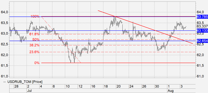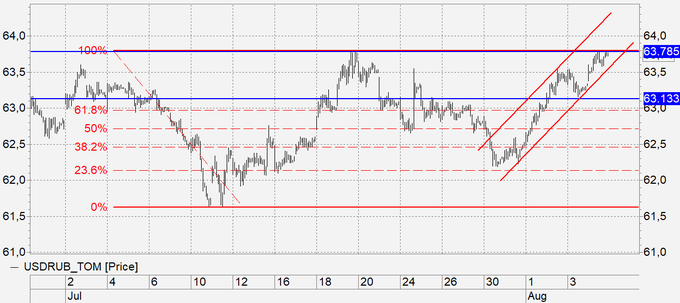 Рубль: вспоминается трансляция старта ракеты: протяжка один, протяжка два, предварительное, промежуточное… вот нам осталось до «есть отрыв от стартового стола» сегодня без коррекции вниз взять 63.80, после того, как вчера прошли не заметив 63.50, и далее только вверх. Интрига в том, что именно коррекция-то уже и назрела. Последние торговые дни мы растем практически безоткатно. Так вот, если отката сегодня не будет, это четкий сигнал на прорыв. Но мы то уже давно в позиции.  Просто смотрим чем дело кончится. А может, все только начинается…