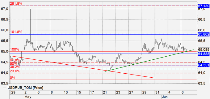 Рубль: если быки хотят попасть в рай, то им надо сегодня двигать доллар наверх. В противном случае время выйдет и мы естественным образом пропилим линию поддержки после чего падем. Стоит признать, что нефть удержалась выше 60.00, политический фон стабилен и даже цветет российско-китайская любовь на фоне империалистической тирании Вашингтона по отношению к Пекину. Доллар не может продолжать усиливаться в силу достигнутого предела темпа роста экономики США. Все это создает для рубля вполне комфортные условия.