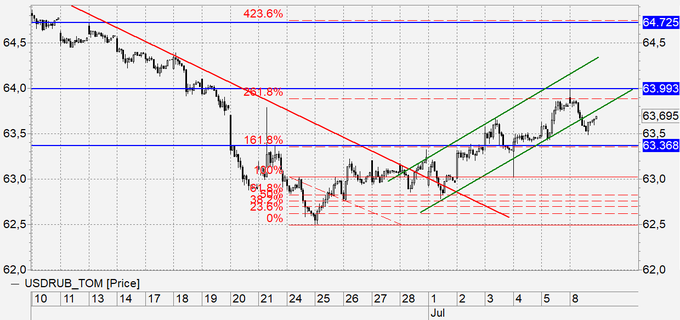 Рубль: вчерашние данные по замедлению инфляции в РФ от Росстата, сейчас мы идем на 4.7% годовых, оказали поддержку рублю. Это означает, что даже если ЦБ РФ снизит ставку, то зазор между доходностью долговых бумаг и инфляцией будет составлять около 2.5%, что весьма приемлемо для активов высокого уровня надежности. Уровень 63.36 выделим на сегодня как основной. Если цены уйдут ниже него, то рубль может вновь начать укрепляться.