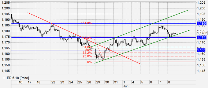 Евро: перед выходом важной статистики рынок занимает равновесное положение. То, что мы не полезли выше 1.1870 накануне заседаний Центробанков США и ЕС (13 и 14 июня, соответственно) не удивляет. Насколько сильным будет вред для триллионной экономики Еврозоны от санкций на пару десятков миллиардов в результате торговой войны еще вопрос. Поэтому, с выводами о безмерной силе доллара можно спорить.