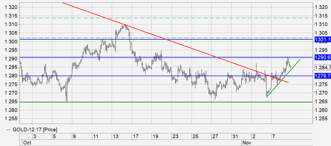 Золото: если уровень 1280 выстоит сегодня, то восходящее движение продолжиться к 1300. В противном случае, медведи будут интенсивно проталкивать рынок вниз к 1250.