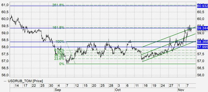 Наиболее вероятно: уровень 59.00 – критический, если рынок пробьет 59.00 вниз, то падение к 58.50.