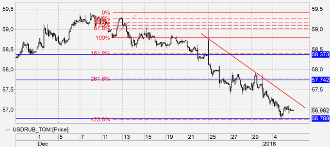 Рубль: ждем рывка по нефти вверх на 50 центов и очередного удара по доллару со стороны рубля до 56.75. После чего должен последовать разворот вверх. Сегодня первый рабочий день в России после каникул. Начало торгов может быть весьма энергичным.