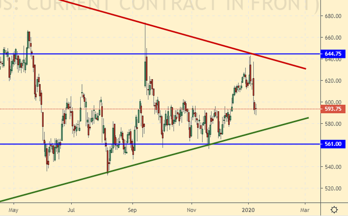 Сценарий роста: рассматриваем февральский фьючерс, дата экспирации 12 февраля. Мы продолжаем находиться в сходящемся треугольнике. С точки зрения техники, шансы на рост минимальны, но пока они есть. Покупаем. В случае роста выше 645.0 можно добавить.
