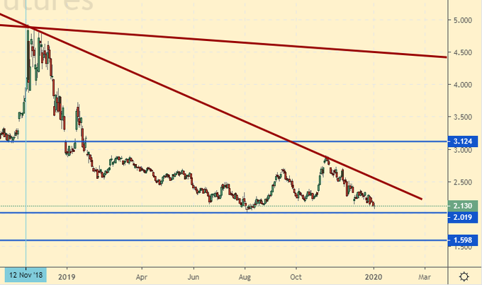 Сценарий роста: рассматриваем февральский фьючерс с датой экспирации 29 января. Быки пока ничего не могут предложить рынку. Текущая теплая зима создает предпосылки к тому, что европейские хранилища не будут полностью опустошены и переходящие запасы уже на сезон 20/21 будут большими. В будущем мы не оставим своих попыток покупать на разворотах рынка вверх просто потому, что внизу перспектив не осталось. Однако, на данный момент места для входа вверх нет. Потенциально интересен уровень 1.60.