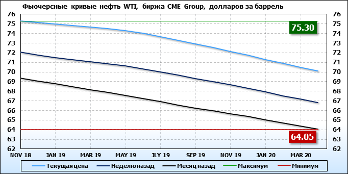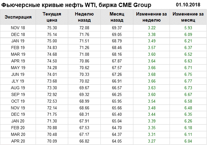 Фьючерсные кривые. Нефть. Биржи CME Group и ICE. Данные на 01.10.18