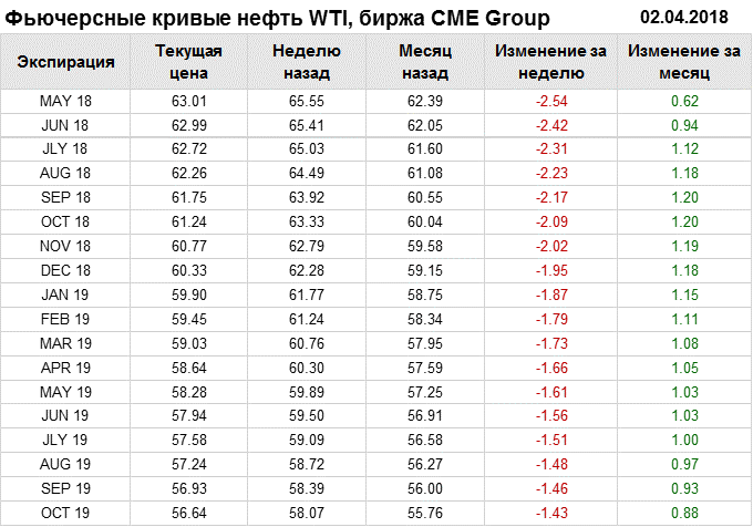 Фьючерсные кривые. Нефть. Биржи CME Group и ICE. Данные на 02.04.2018
