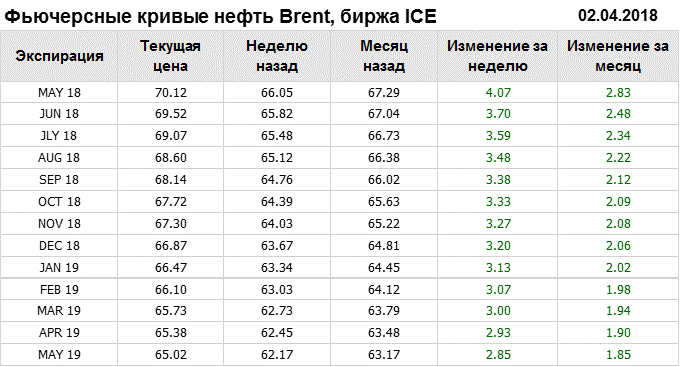 На 02.04.2018 стоимость нефти марки Brent на бирже ICE по контракту MAY 18 составила 70.12 доллара за баррель. За прошедшую неделю стоимость нефти марки Brent выросла на 4.07 $/баррель.