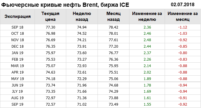 Фьючерсные кривые. Нефть. Биржи CME Group и ICE. Данные на 02.07.2018