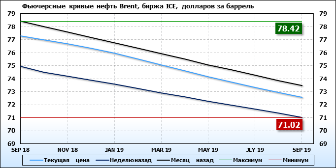 На 02.07.2018 стоимость нефти марки Brent на бирже ICE по контракту SEP 18 составила 77.3 доллара за баррель. За прошедшую неделю стоимость нефти марки Brent выросла на 2.36 $/баррель. Как мы видим, на графике, фьючерсная кривая имеет периоды, когда более дальний фьючерс дешевле ближнего. Состояние бэквардации наблюдаем на следующих контрактах: OCT 18; NOV 18; DEC 18; JAN 19; FEB 19; MAR 19; APR 19; MAY 19; JUN 19; JLY 19; AUG 19; SEP 19. Таким образом, трейдеры предполагают, что возможно превалирование предложения над спросом в указанные периоды, если рынок будет находиться на данных ценовых уровнях.