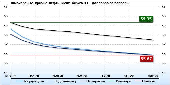 На 02.09.19 стоимость нефти марки Brent на бирже ICE по контракту NOV 19 составила 58.66 доллара за баррель. За прошедшую неделю стоимость нефти марки Brent выросла на 0.54 $/баррель. Как мы видим на графике, фьючерсная кривая имеет периоды, когда более дальний фьючерс дешевле ближнего. Состояние бэквардации наблюдаем на следующих контрактах: DEC 19; JAN 20; FEB 20; MAR 20; APR 20; MAY 20; JUN 20; JLY 20; AUG 20; SEP 20; OCT 20; NOV 20. Таким образом, трейдеры предполагают, что возможно превалирование предложения над спросом в указанные периоды, если рынок будет находиться на данных ценовых уровнях.