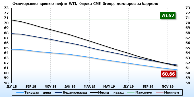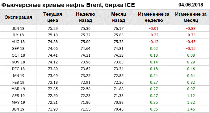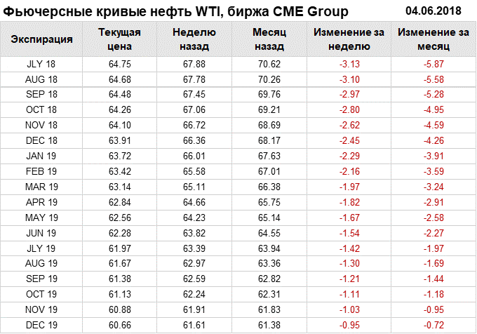 Фьючерсные кривые. Нефть. Биржи CME Group и ICE. Данные на 04.06.2018
