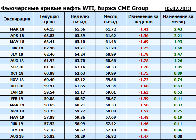 Фьючерсные кривые. Нефть. Биржи CME Group и ICE. Данные на 06.02.2018