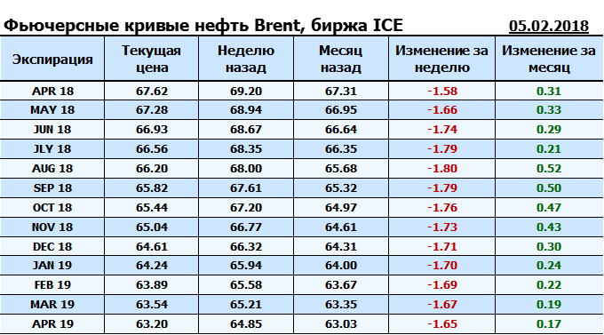 На 05.02.2018 стоимость нефти марки Brent на бирже ICE по контракту APR 18 составила 67.62 долларов за баррель. За прошедшую неделю стоимость нефти марки Brent упала на 1.58 $/баррель. Как мы видим, на графике, фьючерсная кривая имеет периоды, когда более дальний фьючерс дешевле ближнего. Состояние бэквардации наблюдаем на следующих контрактах: MAY 18; JUN 18; JLY 18; AUG 18; SEP 18; OCT 18; NOV 18; DEC 18; JAN 19; FEB 19; MAR 19; APR 19. Таким образом, трейдеры предполагают, что возможно превалирование предложения над спросом в указанные периоды, если рынок будет находиться на данных ценовых уровнях.