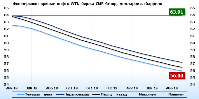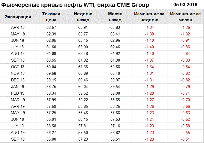 На 05.03.2018 стоимость нефти марки WTI на бирже CME Group по контракту APR 18 составила 62.57 доллара за баррель. За прошедшую неделю стоимость нефти марки WTI упала на 1.34 $/баррель. Как мы видим, на графике, фьючерсная кривая имеет периоды, когда более дальний фьючерс дешевле ближнего. Состояние бэквардации наблюдаем на следующих контрактах: MAY 18; JUN 18; JLY 18; AUG 18; SEP 18; OCT 18; NOV 18; DEC 18; JAN 19; FEB 19; MAR 19; APR 19; MAY 19; JUN 19; JLY 19; AUG 19; SEP 19. Таким образом, трейдеры предполагают, что возможно превалирование предложения над спросом в указанные периоды, если рынок будет находиться на данных ценовых уровнях.