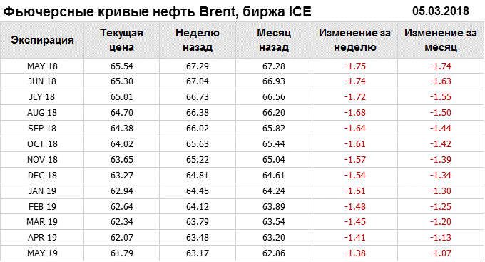 Фьючерсные кривые. Нефть. Биржи CME Group и ICE. Данные на 06.03.2018