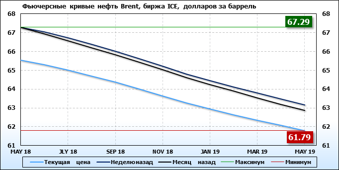 На 05.03.2018 стоимость нефти марки Brent на бирже ICE по контракту MAY 18 составила 65.54 долларов за баррель. За прошедшую неделю стоимость нефти марки Brent упала на 1.75 $/баррель. Как мы видим, на графике, фьючерсная кривая имеет периоды, когда более дальний фьючерс дешевле ближнего. Состояние бэквардации наблюдаем на следующих контрактах: JUN 18; JLY 18; AUG 18; SEP 18; OCT 18; NOV 18; DEC 18; JAN 19; FEB 19; MAR 19; APR 19; MAY 19. Таким образом, трейдеры предполагают, что возможно превалирование предложения над спросом в указанные периоды, если рынок будет находиться на данных ценовых уровнях.