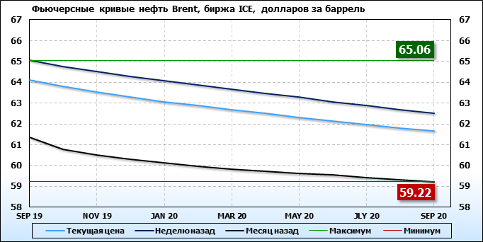 На 08.07.19 стоимость нефти марки Brent на бирже ICE по контракту SEP 19 составила 64.11 доллара за баррель. За прошедшую неделю стоимость нефти марки Brent упала на 0.95 $/баррель. Как мы видим на графике, фьючерсная кривая имеет периоды, когда более дальний фьючерс дешевле ближнего. Состояние бэквардации наблюдаем на следующих контрактах: OCT 19; NOV 19; DEC 19; JAN 20; FEB 20; MAR 20; APR 20; MAY 20; JUN 20; JLY 20; AUG 20; SEP 20. Таким образом, трейдеры предполагают, что возможно превалирование предложения над спросом в указанные периоды, если рынок будет находиться на данных ценовых уровнях.