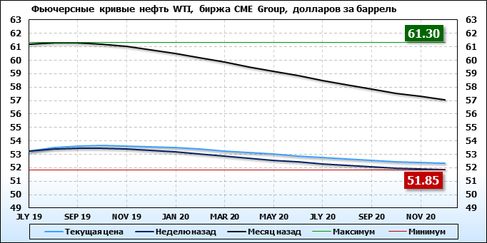 На 10.06.19 стоимость нефти марки WTI на бирже CME Group по контракту JLY 19 составила 53.26 доллара за баррель. За прошедшую неделю стоимость нефти марки WTI выросла на 0.01 $/баррель. Как мы видим на графике, фьючерсная кривая имеет периоды, когда более дальний фьючерс дешевле ближнего. Состояние бэквардации наблюдаем на следующих контрактах: NOV 19; DEC 19; JAN 20; FEB 20; MAR 20; APR 20; MAY 20; JUN 20; JLY 20; AUG 20; SEP 20; OCT 20; NOV 20; DEC 20. Таким образом, трейдеры предполагают, что возможно превалирование предложения над спросом в указанные периоды, если рынок будет находиться на данных ценовых уровнях.